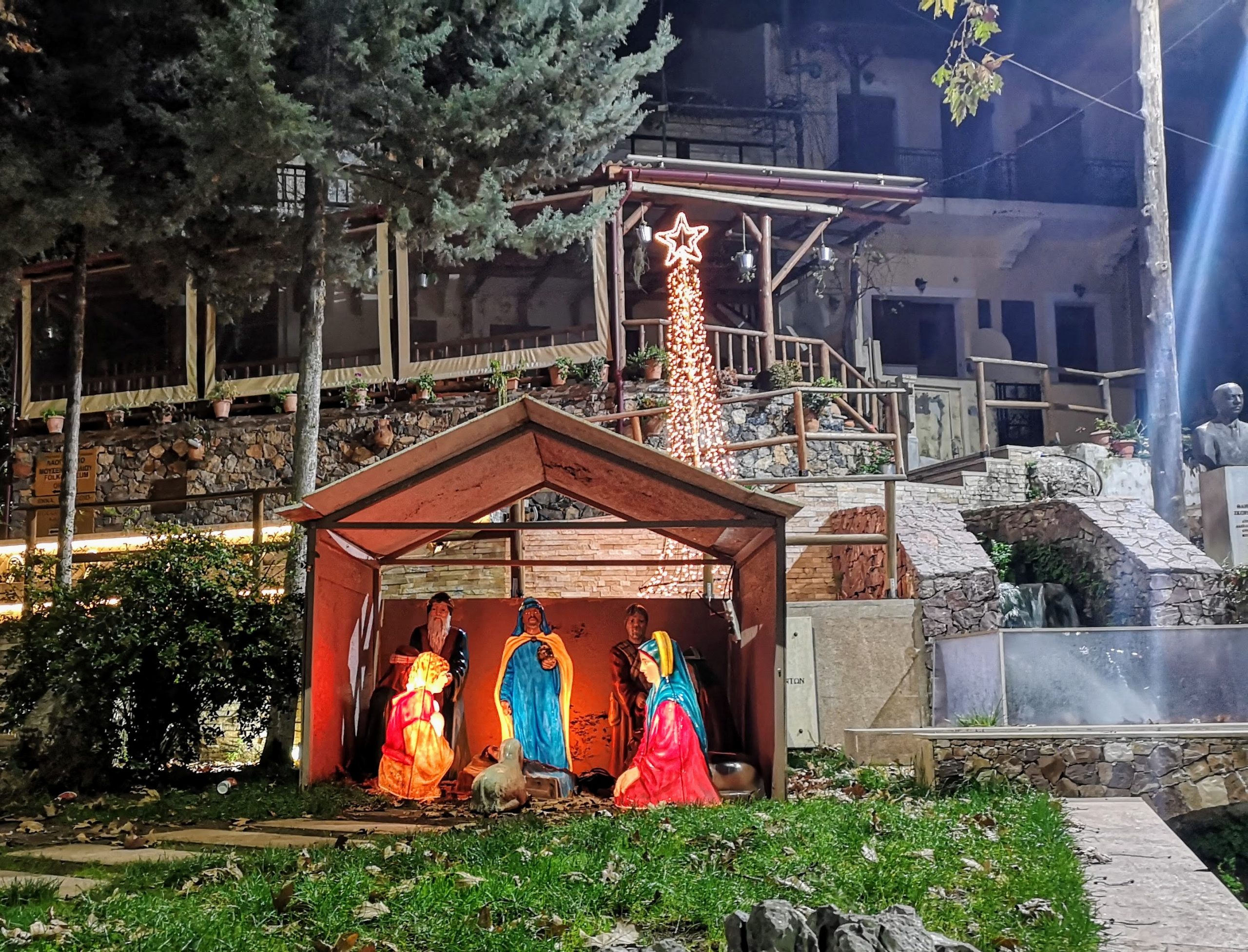 På kvällen vandrar längs huvudgatan på jakt efter någonstans att äta middag. Vi går in på den ena av byns två kafenion och frågar om de har mat. Det har de. Potatis bakas i vedkaminen mitt i rummet och vi får snart in ett fat, tillsammans med andra grönsaker, olivolja och ost. God och närande vintermat, alla råvaror kommer från trakten, inklusive vinet och den hemgjorda tsikoudia som värden bjuder på.