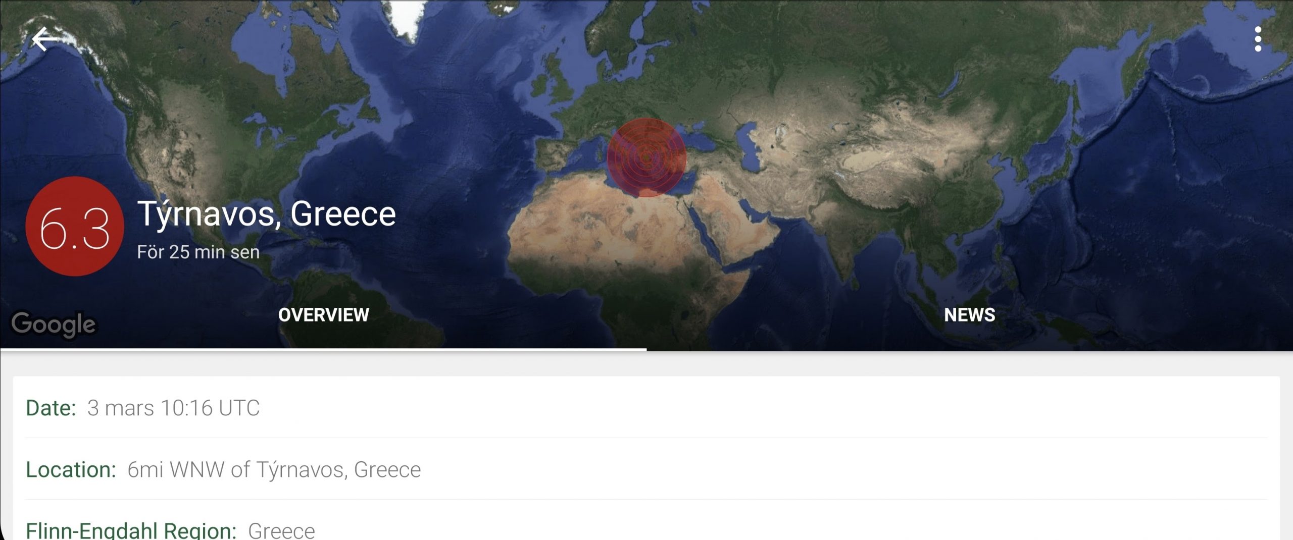 Skalvet, som uppmättes till 6,3 på Richterskalan, inträffade utanför staden Tirnavos, som ligger ungefär mitt emellan Thessaloniki och Aten, 25 kilometer nordväst om Larissa, som med sina 145 000 invånare är Greklands fjärde största stad.