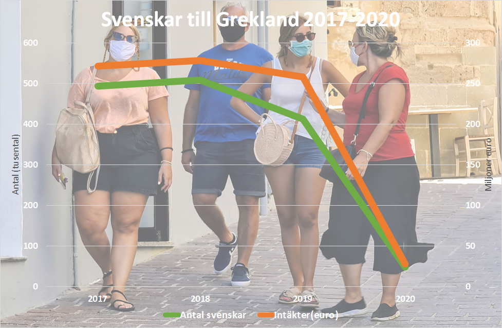 Det svenska intresset för Grekland minskade markant redan rekordåret 2019. Då minskade antalet turister från Sverige med 18,9 procent, jämfört med året innan. Antalet resenärer från Danmark minskade ännu mer, med 20 procent. Samtidigt som turismen till Grekland slog nytt rekord, med över 34 miljoner besökare, kom det 96 000 färre svenskar och 77 000 färre danskar. Norge finns inte med i statistiken.