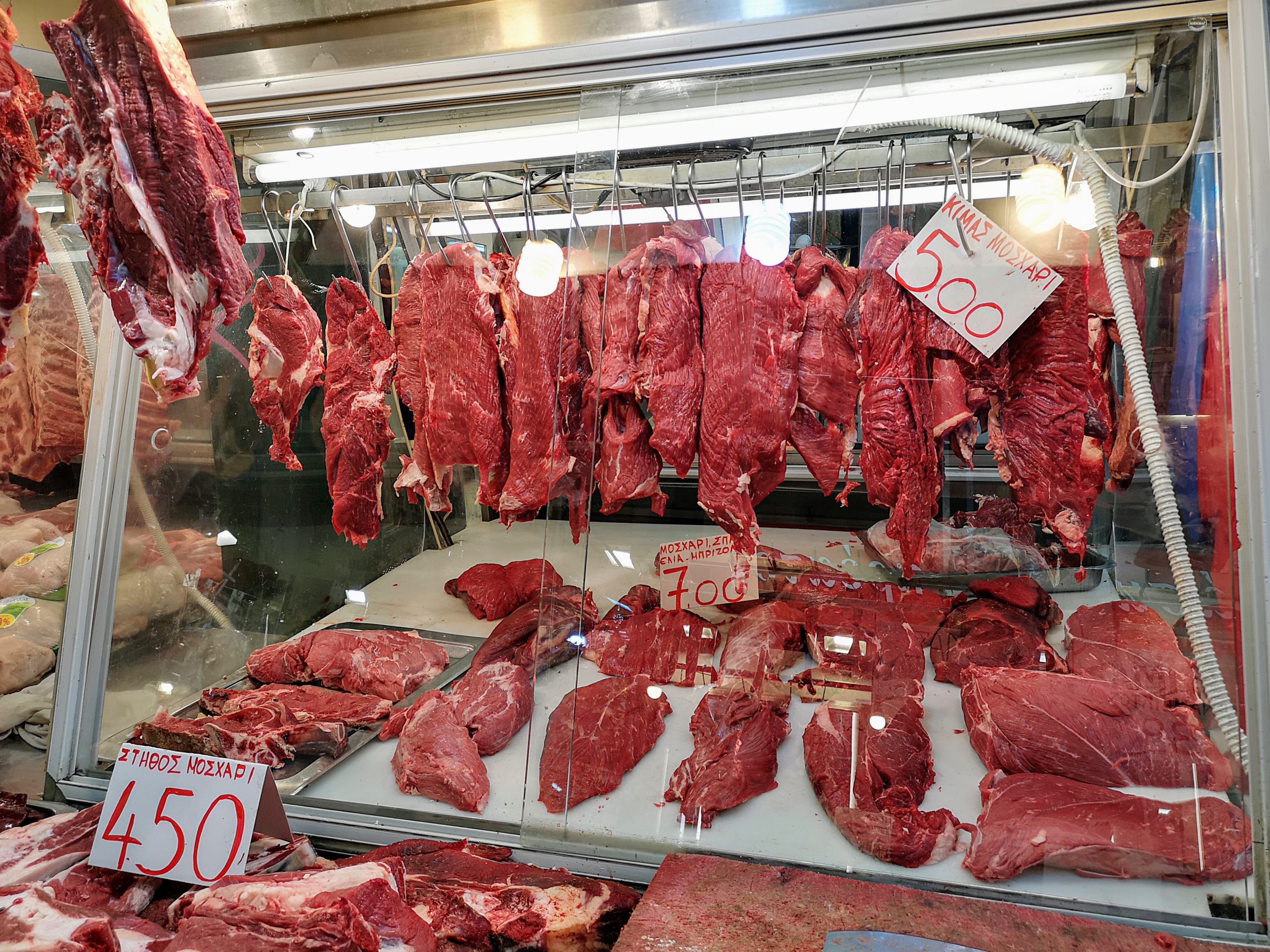 En dag hade vi blivit så sugna på något annat än den ofta mediokra maten på tavernorna och det begränsade utbudet i snabbköpet att vi bestämde oss för att försöka köpa en oxfilé av slaktaren. Bära eller brista – nu skulle det ske!
