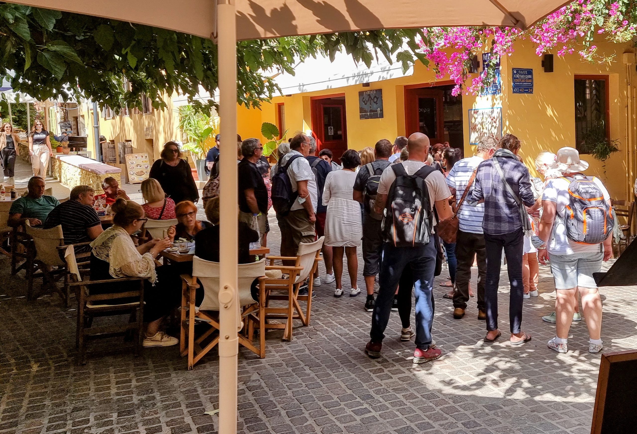 Även om alla har munskydd inomhus så är det många som har dem under näsan och trängseln är lika stor som den brukar vara i Aten. Det är proppfullt med turister som trängs med atenare på gator och torg, mycket få har munskydd, tots att de enligt lag ska ha det när trängsel uppstår. I Chania såg vi inga poliser som kontrollerade efterlevnaden men i Aten patrullerade poliser gatorna i turistkvarteren.