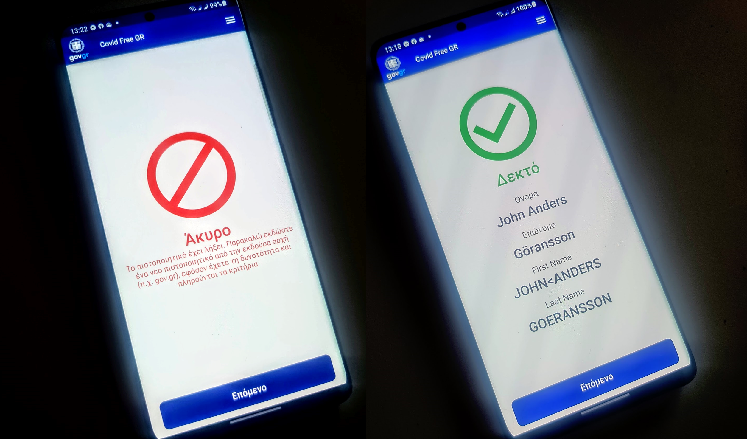 Grekland är indelat i tre zoner: Covidfria, blandade och övriga. I Covidfria zoner måste alla vara vaccinerade eller ha bevis på genomgången infektion, i blandade zoner kan man i stället visa upp ett högst 48 timmar gammalt testintyg. Det hela sköts med en mobilapp, som läser den QR-kod som finns i Covidbeviset. Appen fungerar även för svenska Covidbevis – vi har testat!