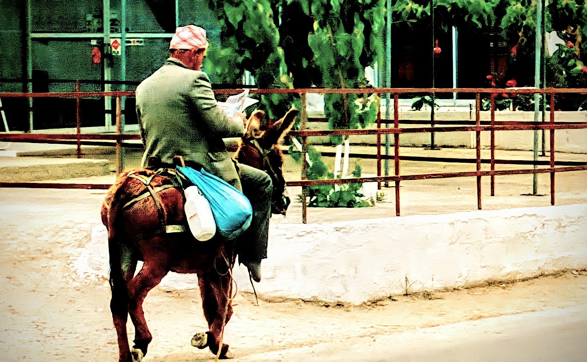 En morgon sitter vi på en uteservering i Platanias och äter frukost. Den hårt trafikerade genomfartsvägen passerar bredvid oss, en i längden ganska deprimerande upplevelse. Husen är så där fula och karaktärslösa som de brukar vara på turistorter. Souvenirbutiker, minimarkets, biluthyrare, barer med plastmöbler… Man vill bara bort. Så händer något som bryter tristessen. En åsna passerar, på ryggen sitter en äldre man i traditionell kretensisk klädsel och läser obekymrat en grekisk dagstidning. Vi kan inte annat än stirra häpet och roat när han passerar.