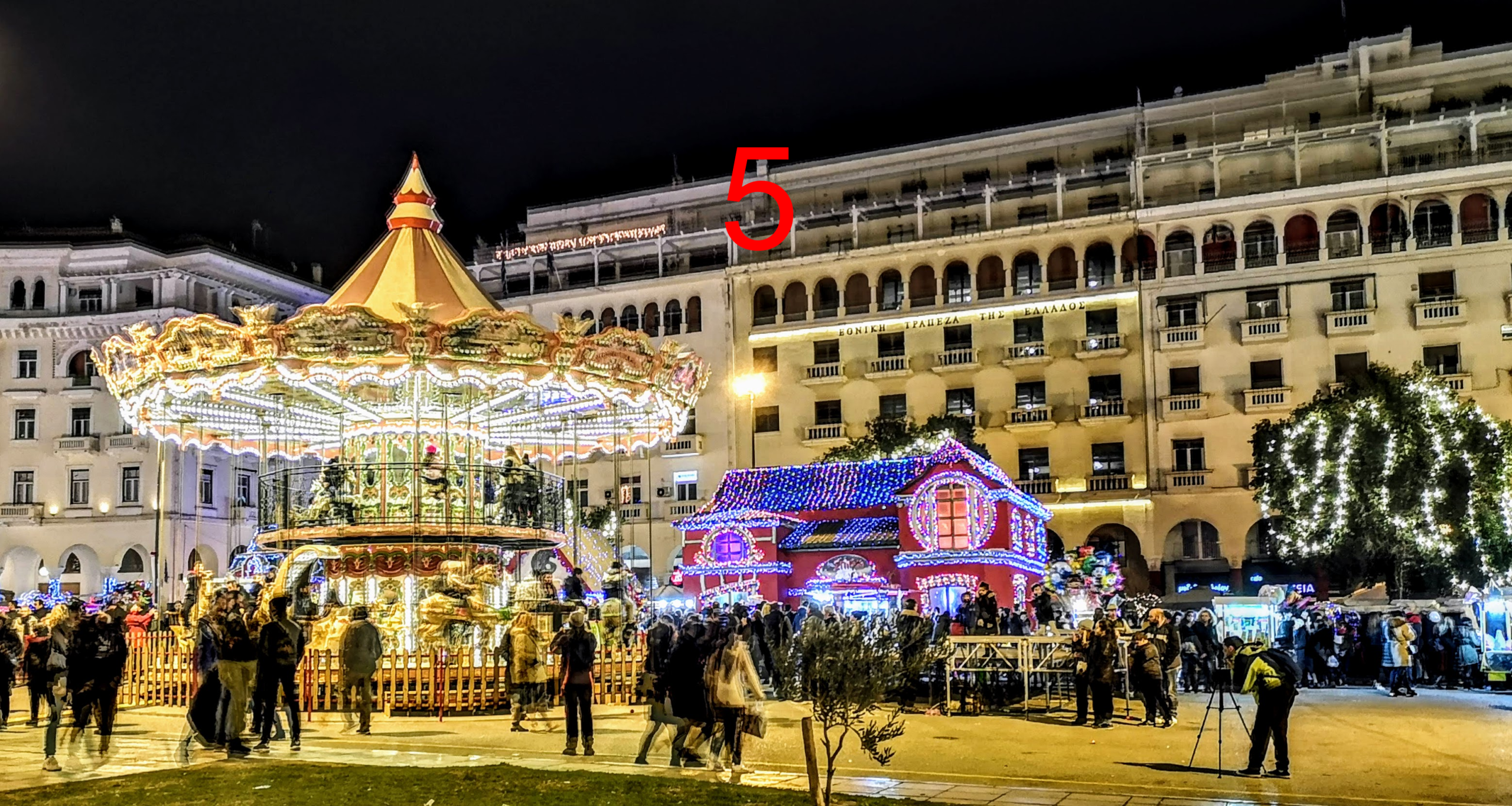 Bilden är tagen på Aristotoulostorget i Thessaloniki julen 2019. I Aten är det Syntagmatorget som förvandlas, varje stad har sin egen plats. Inför julen2016, under den värsta krisen i Greklands moderna historia, byggdes ett pariserhjul på Syntagma. Tyvärr fick det aldrig tillstånd att användas, så det stod stilla och 29 december beslutade stadshuset att det skulle plockas ner.