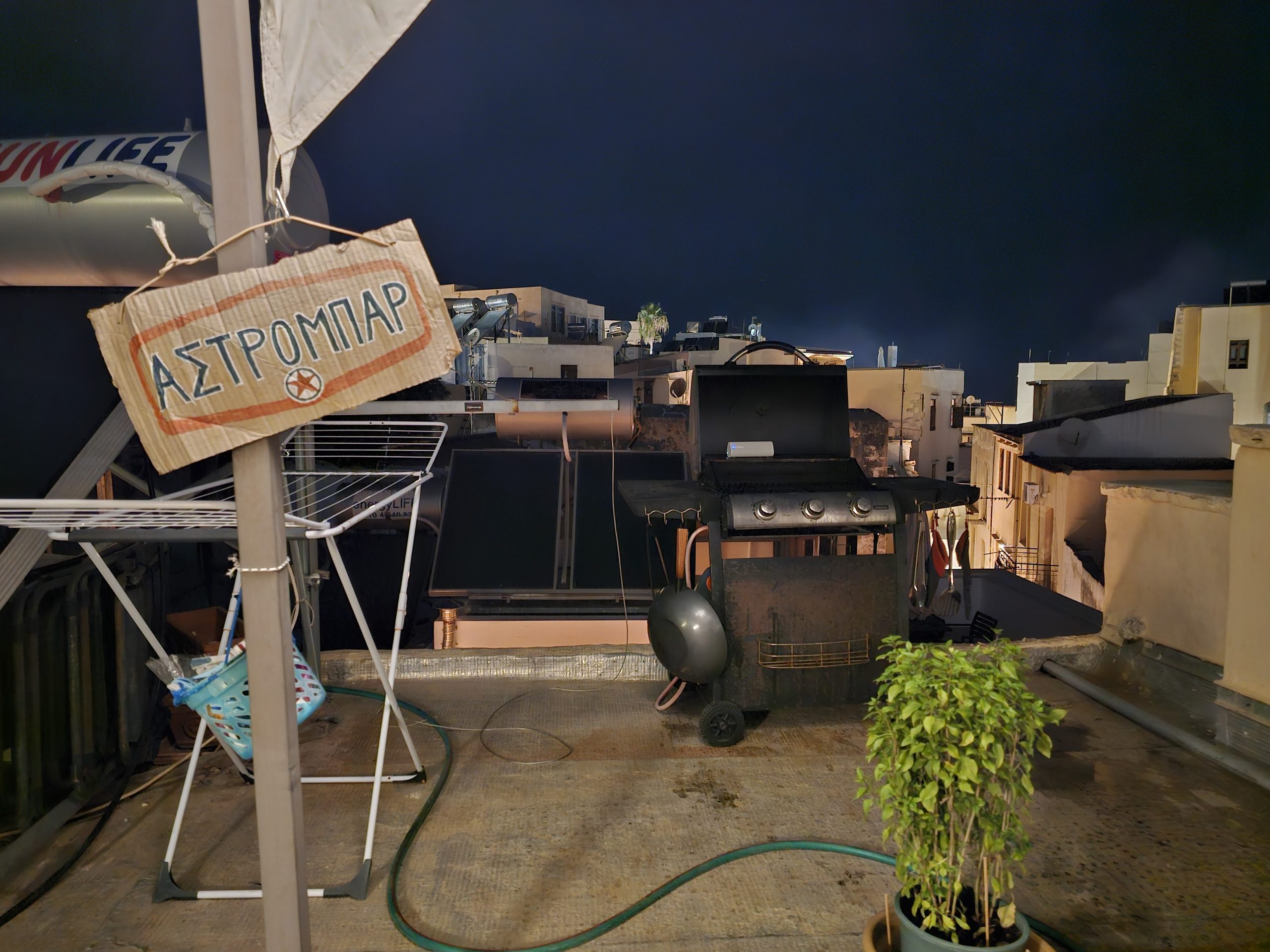 På taket hänger vi tvätten på sommaren. Då odlar vi också chili, basilika, mynta och timjan på taket, plantorna och jorden köper vi i handelsträdgården på Kissamos Street. Där köper vi också medel för att hålla myrorna borta. Det gäller att vattna varje dag, då växer det som tusan. Som tur är finns det vattenutkastare på taket, sedan våren 2024 med både varmt och kallt vatten.