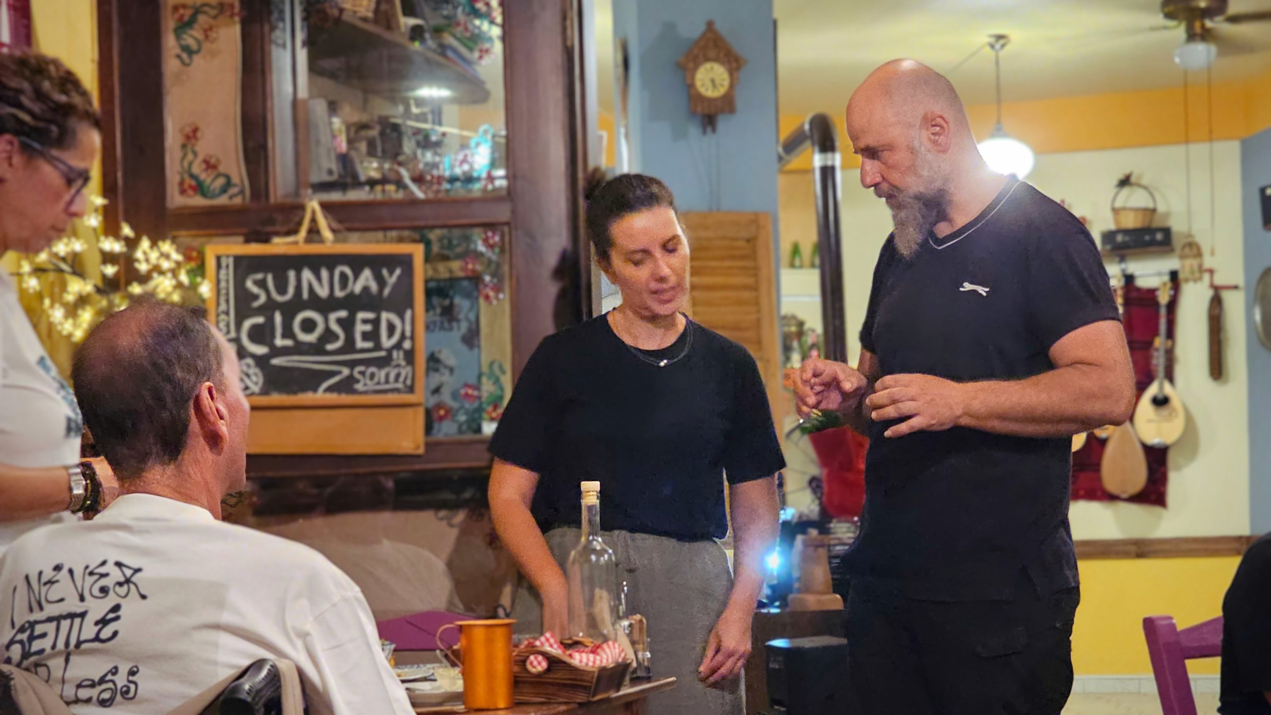 Vi lärde oss att säga ”ti echete simera?”, ”vad har ni i dag?” Det fanns nämligen alltid ett par ”dagens rätt”, nylagade och helt annorlunda än Apeliamenyns trisstess. Där kunde det dyka upp kaningryta, nyfångad fisk, friterade kikärtsbollar och annat smaskens. Med den enkla frasen slapp vi äta pizza eller hamburgare när vi tröttnade på Apeliamenyn.