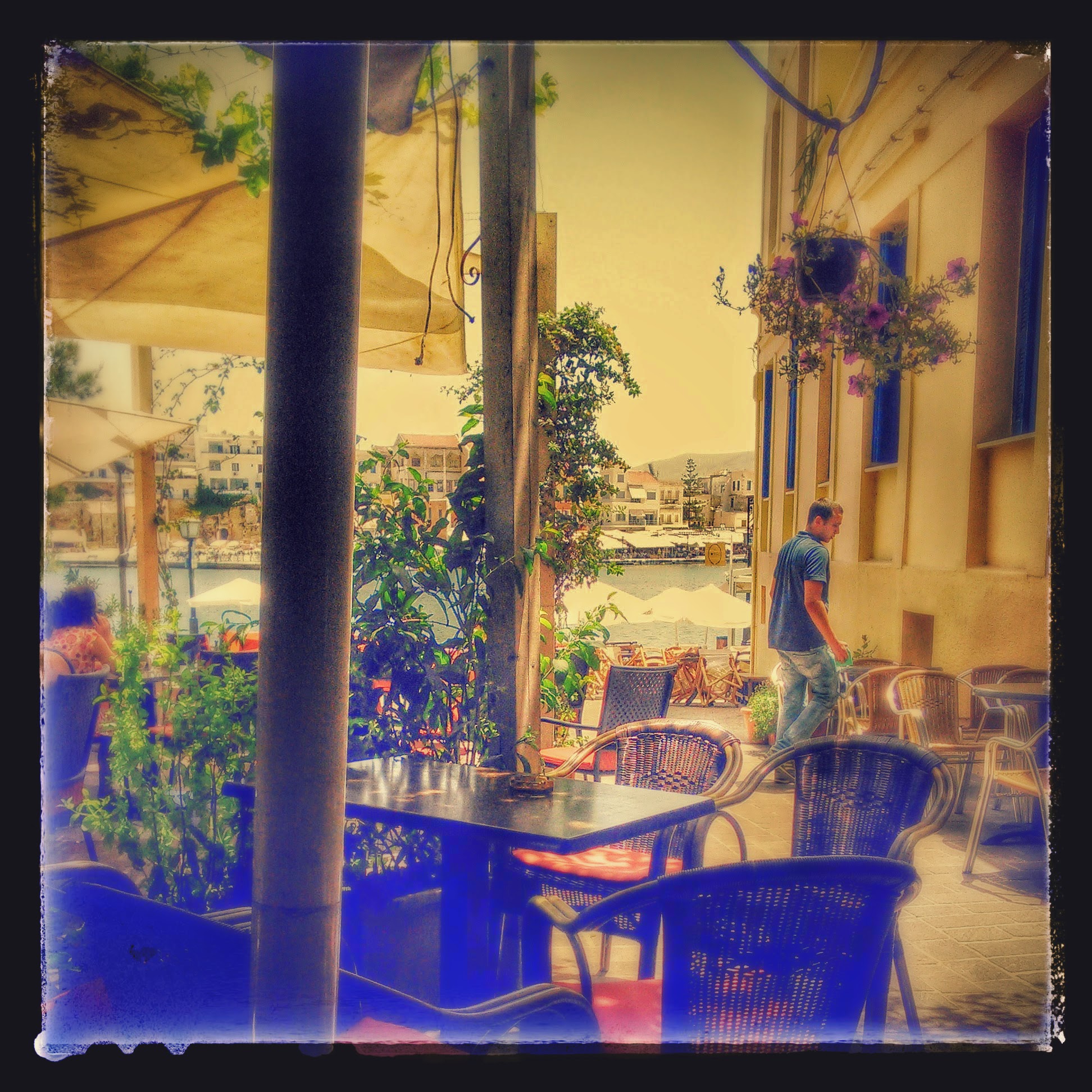 Här, på Meltemi Café runt hörnet från Chanias strandpromenad, har vi suttit många gånger. Det känns inte som om vi har kommit till Chania förrän vi har tagit en kaffe och här och pratat lite med ägaren Yanis och hans buttre medarbetare Giorgos. Mat och dryck är sådär, men läget! Av någon anledning tunnar turistströmmen ut här. Bilden är tagen i slutet av juli 2014, det är proppfullt i hamnen men hit hittar bara ett fåtal.